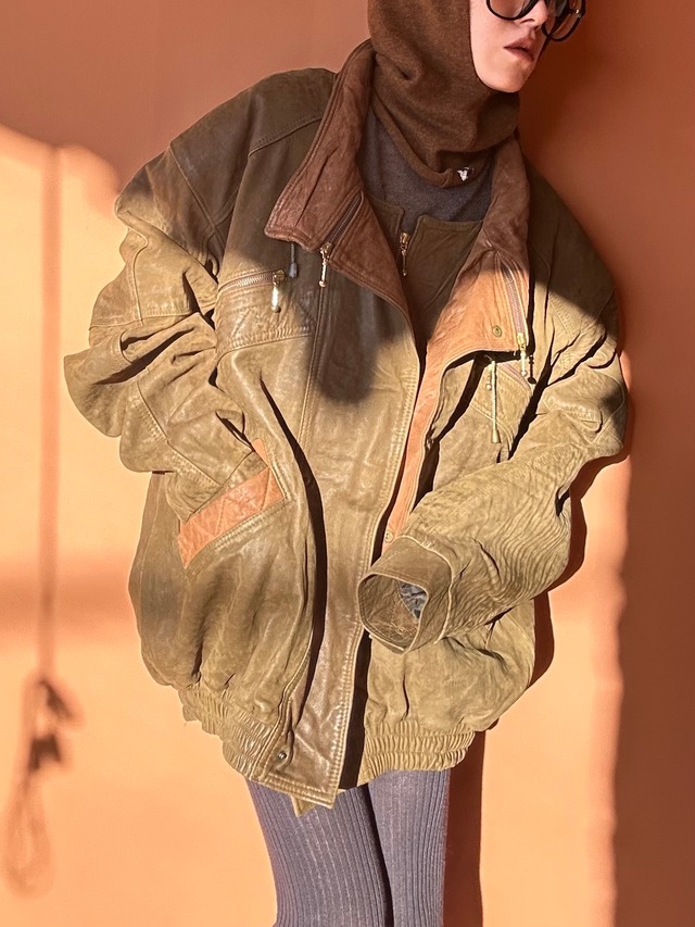 ※ダメージを考慮しprice offいたしました レイヤードデザインのレザーブルゾン 90年代後半ヨーロッパ解釈の構築服 色落ちしたリアルレザーが、スウェードのようなマットな表情に 男性にもおすすめです☺︎ 【Detail】 ・年代: 90s ・生産国: made in Cyprus ・素材: リアルレザー 100% / 裏地:表記なし ・カラー:カーキ×ライトブラウン ※着用モデル 156cm やや細身/腕長め ※自然光で撮影し、実物の雰囲気に近い色味で掲載しています。 【Size】 表記サイズ:XXL 平置き採寸(cm) ・肩幅:57 ・身幅:65 ・袖丈:66 ・着丈:76 ※採寸は多少の誤差があります。 【Condition】 全体的にレザー特有の経年変化があり、右肩に約1.5cmのダメージが見られます。 【お届けについて】 環境に配慮し、最小限の梱包で発送いたします。 到着後すぐ着られるよう、丁寧にスチームケアしてお届けします。 【注意事項】 当店が販売するのは主にvintage古着です。 目立つダメージは記載させていただいておりますが 載せきれない細部の使用感や汚れ、傷などがある場合があります。 古着を理解された上でのご購入をよろしくお願いいたします。 お使いの環境(モニター、ブラウザ等)の違いにより 色の見え方が実物と若干異なる場合があります。 予めご了承くださいませ。 基本的に返品・交換はお受けできません。 何か問題がございましたらお手数ですが お問い合わせくださいませ。