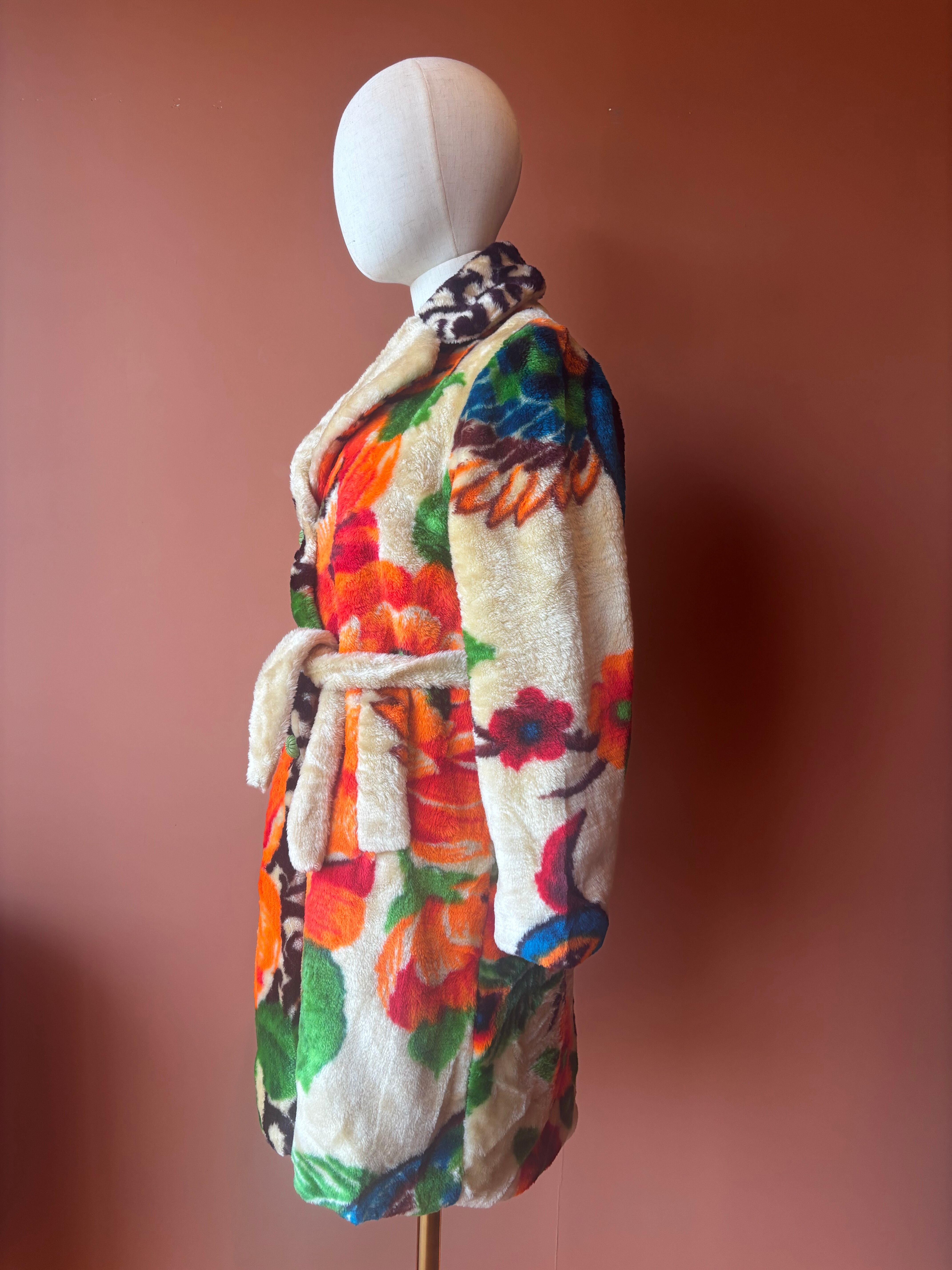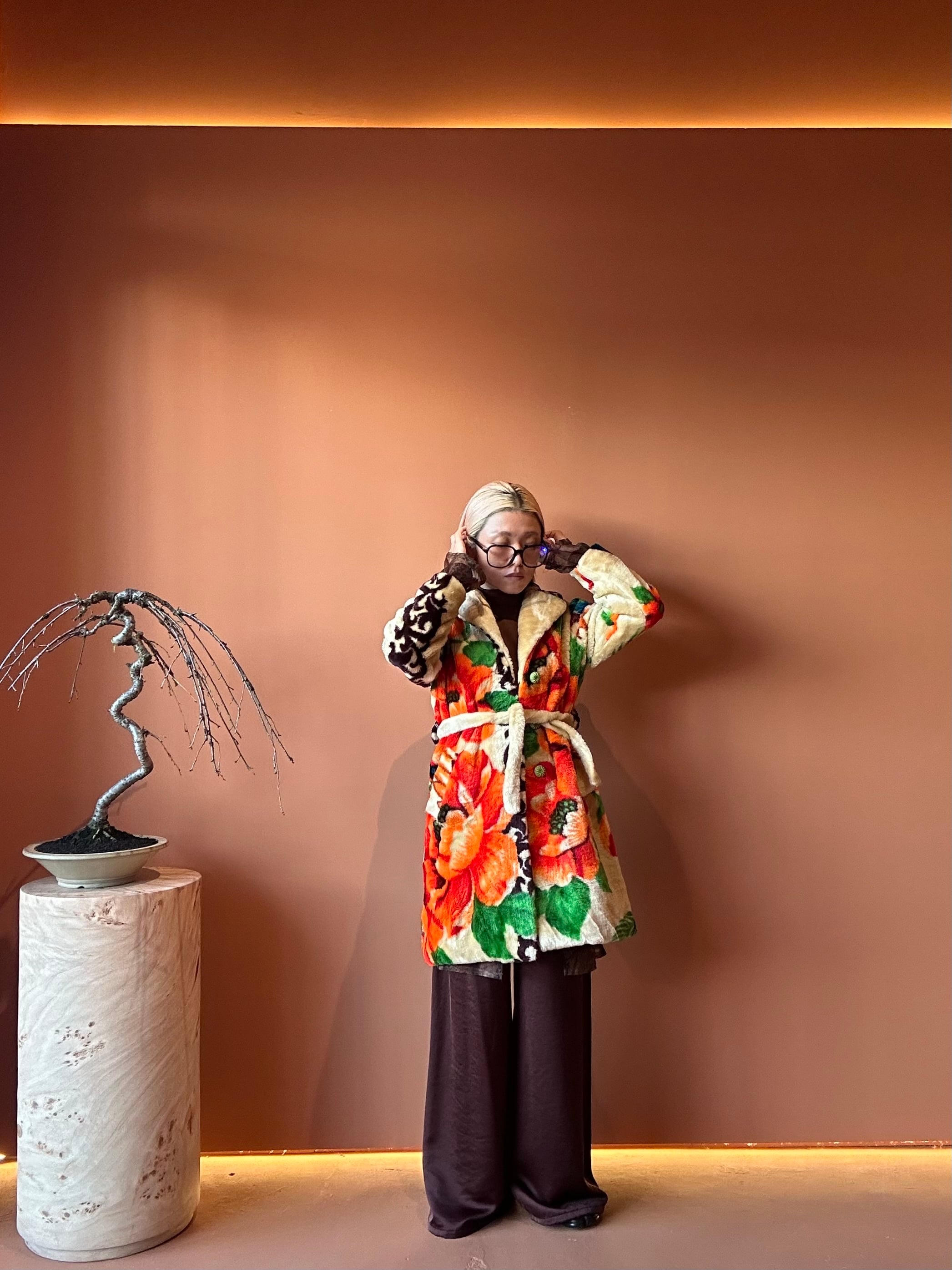 フラワーモチーフが大胆にプリントされたエコファーローブ