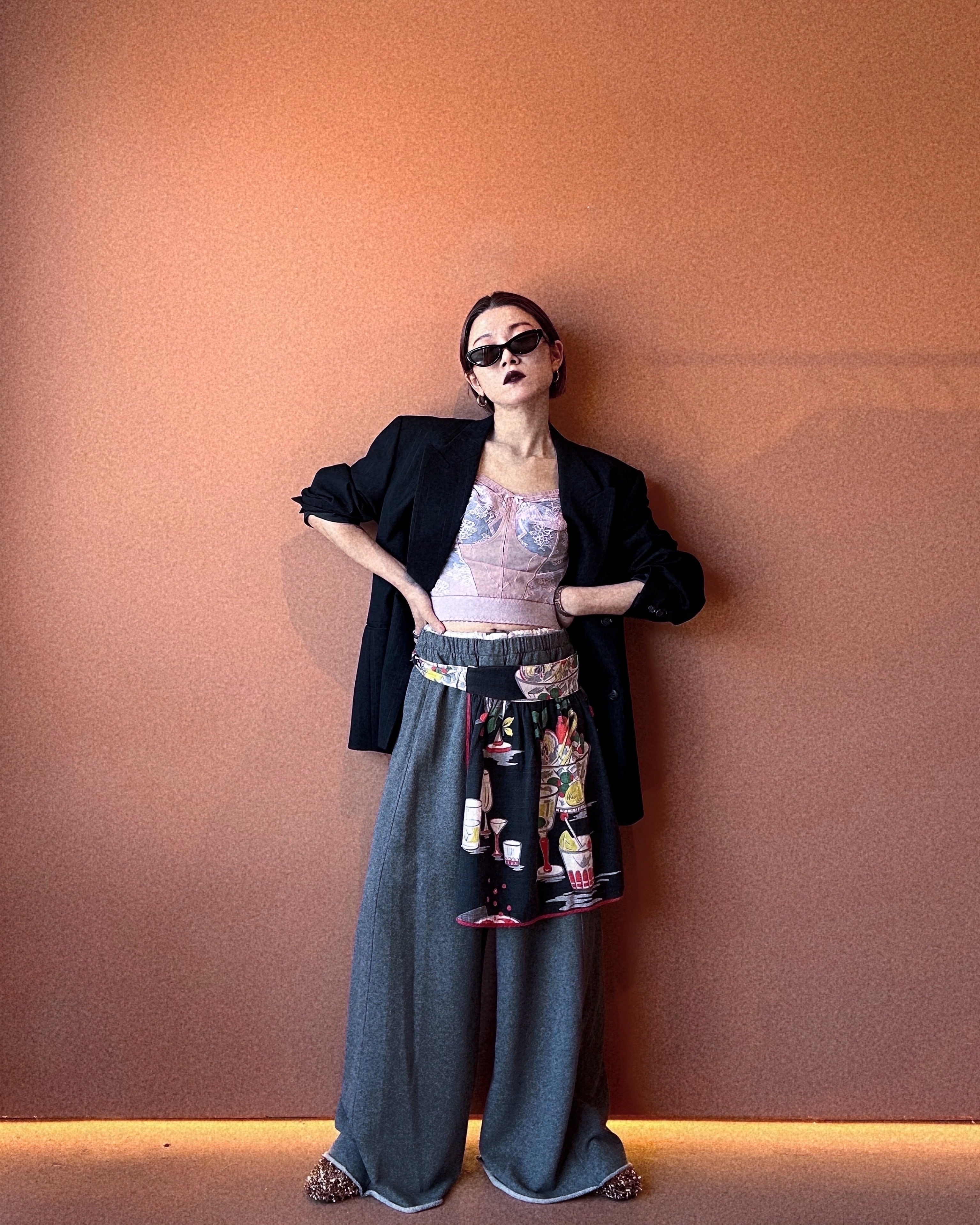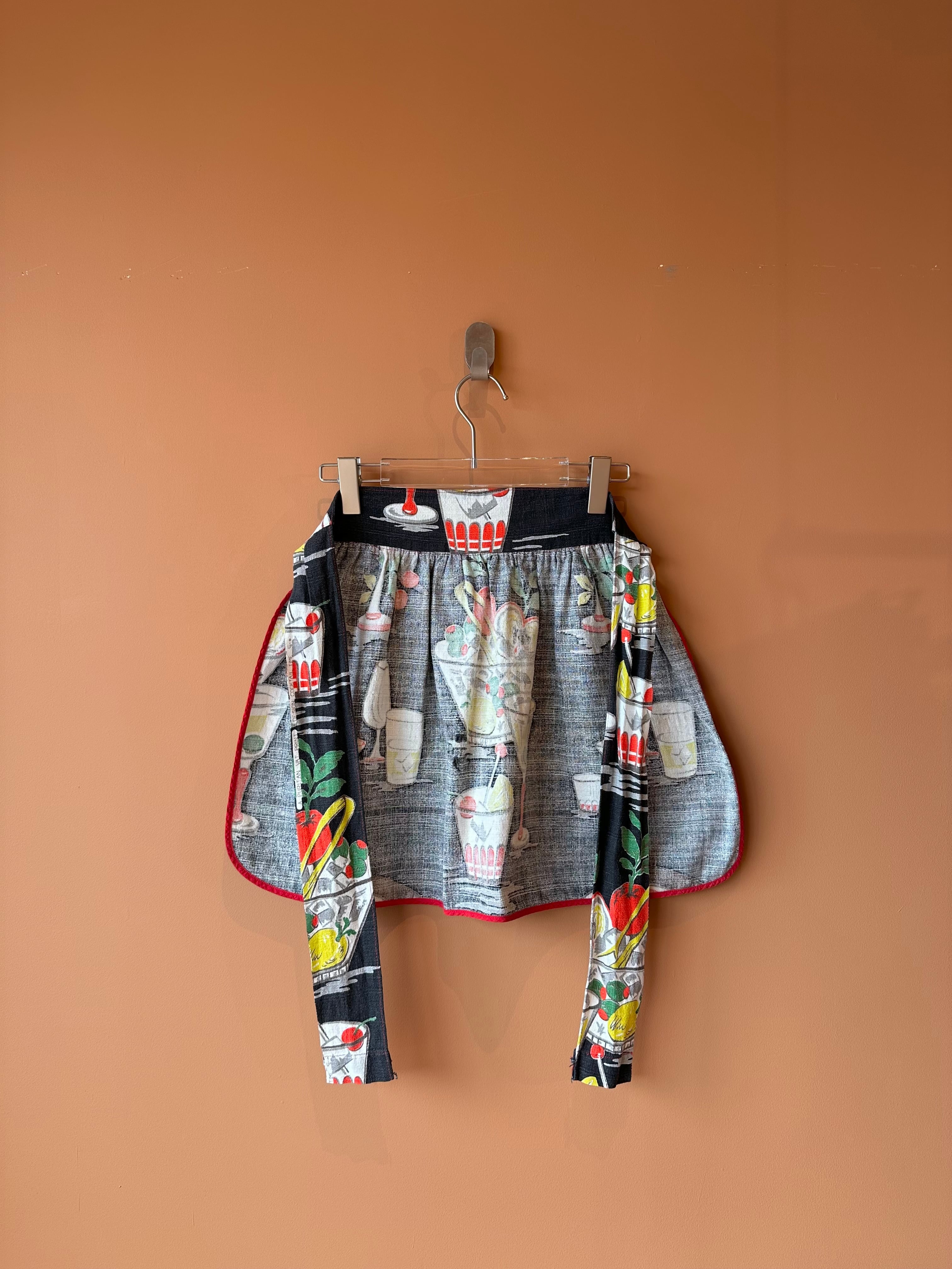 ネイビーベースにカクテルやフルーツが並んだムードのあるヴィンテージラップエプロン。