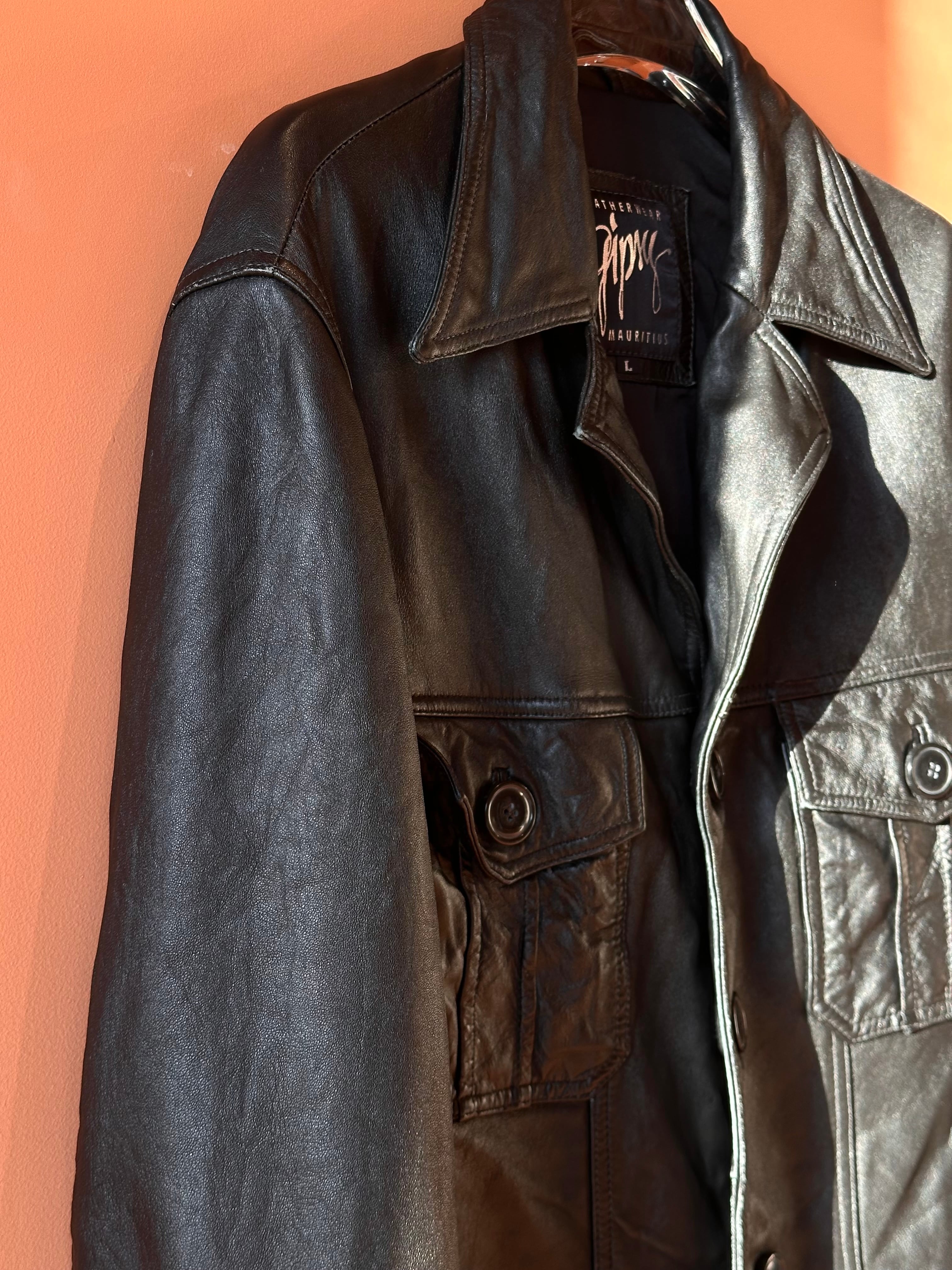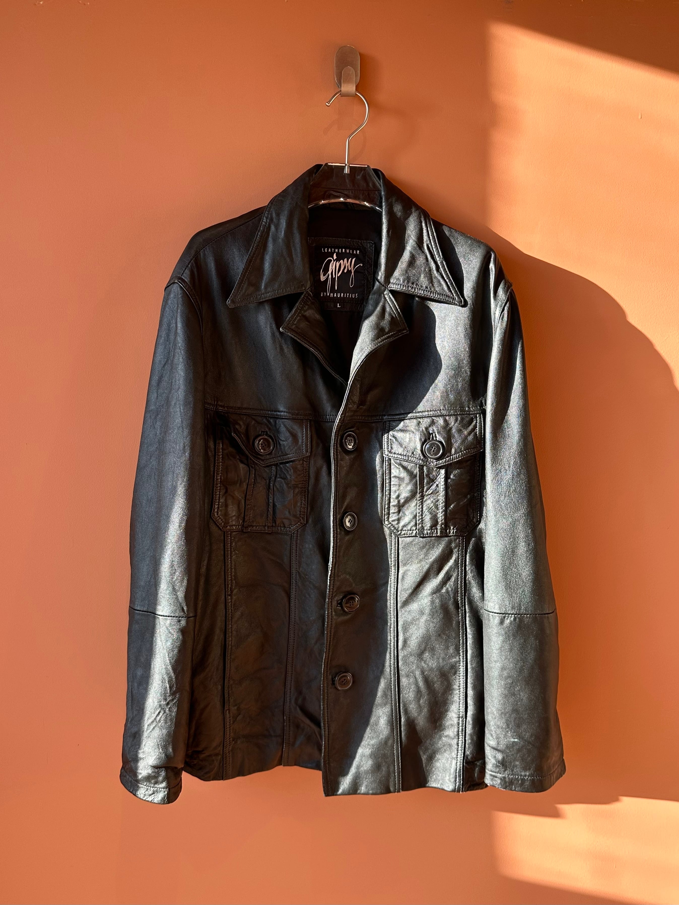 メンズサイズのレザージャケットです。幅広い身長の方にフィットしやすいシャツ型で、今季のムードにも繋げやすいかと思います。