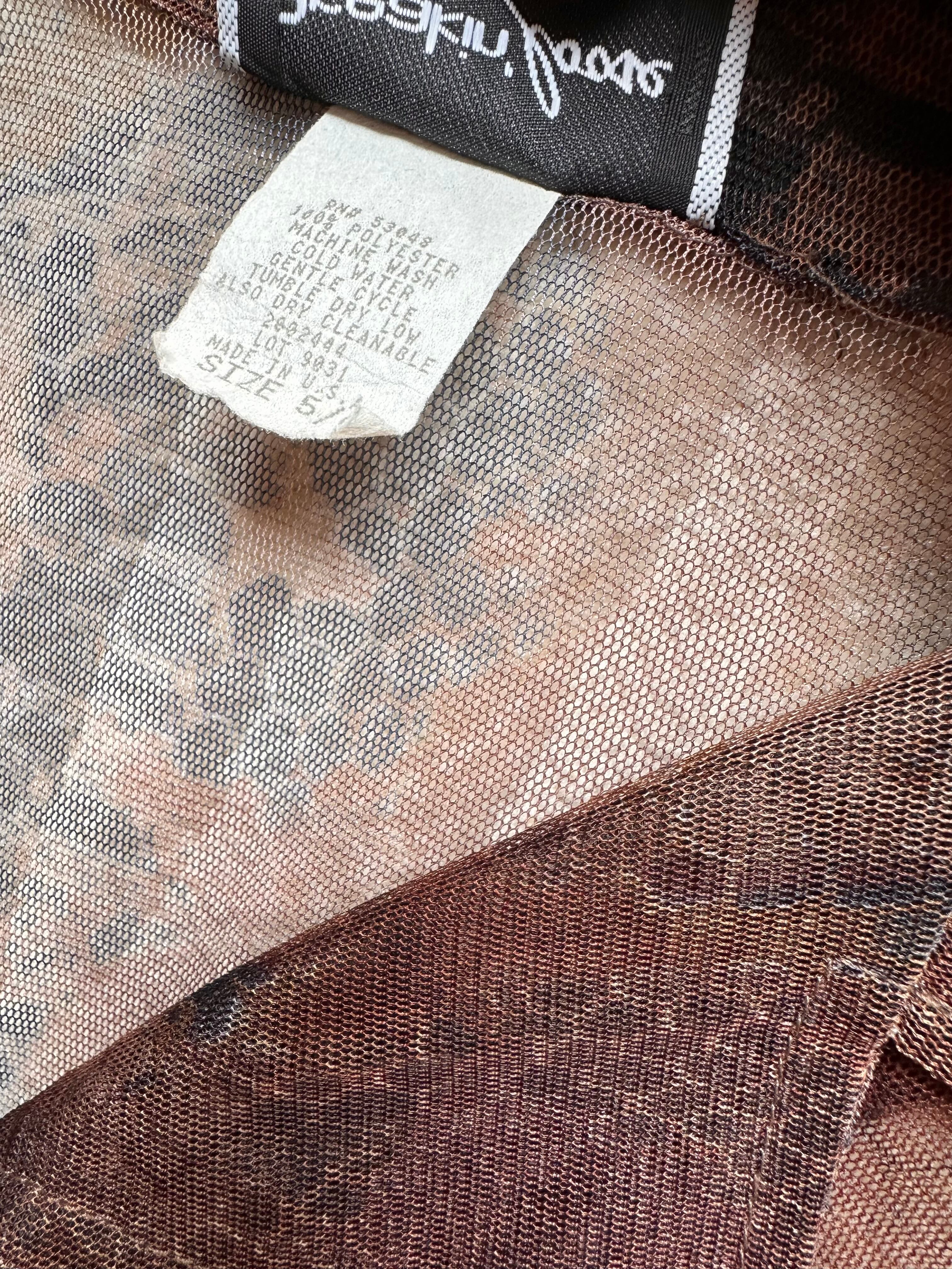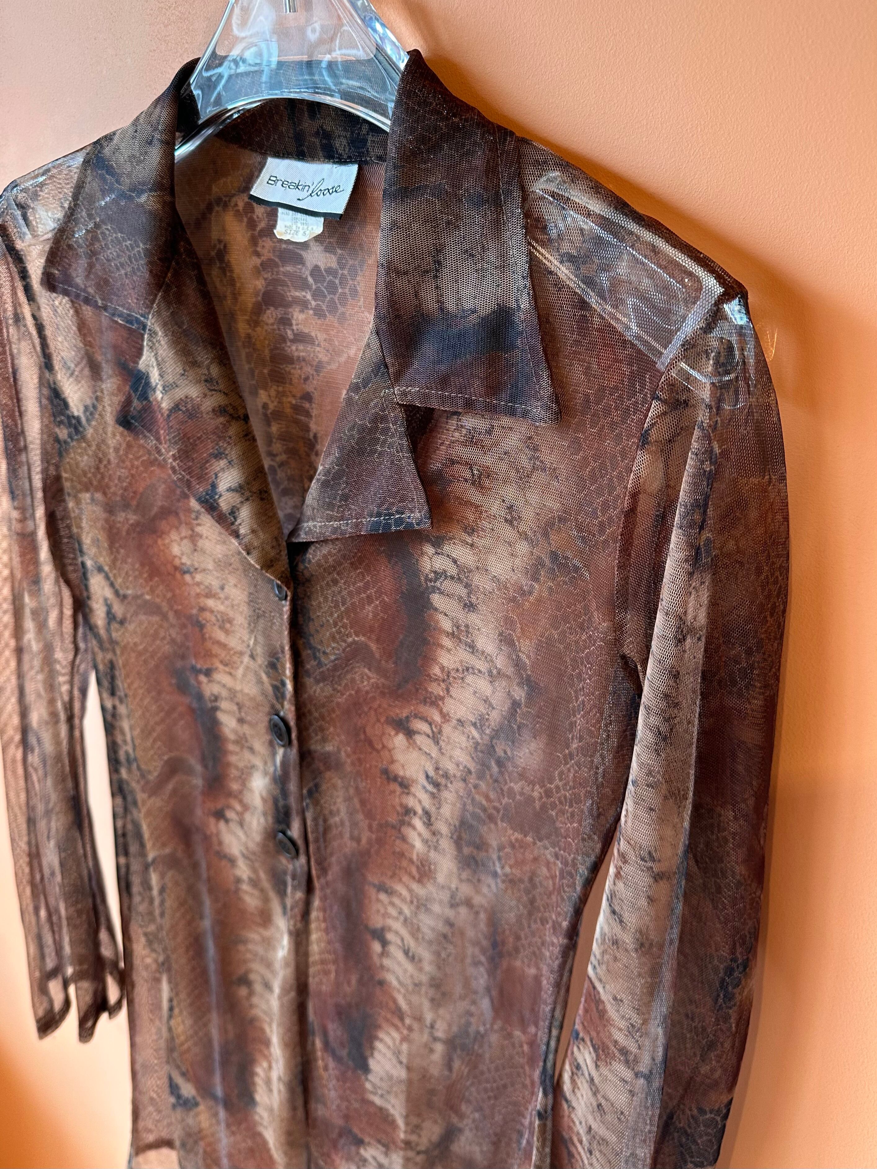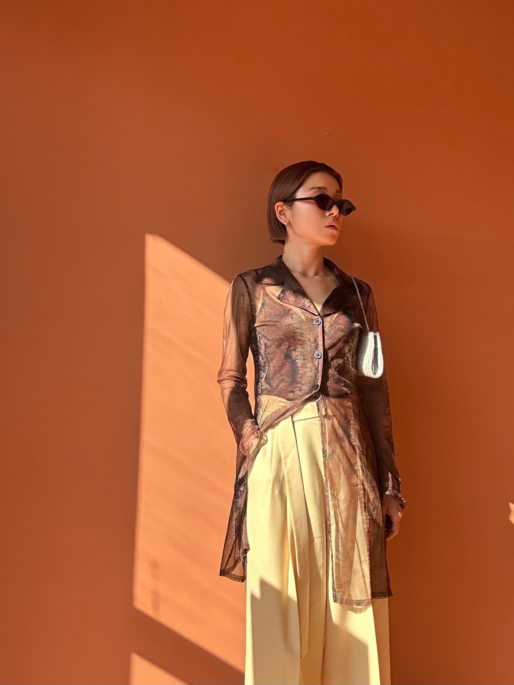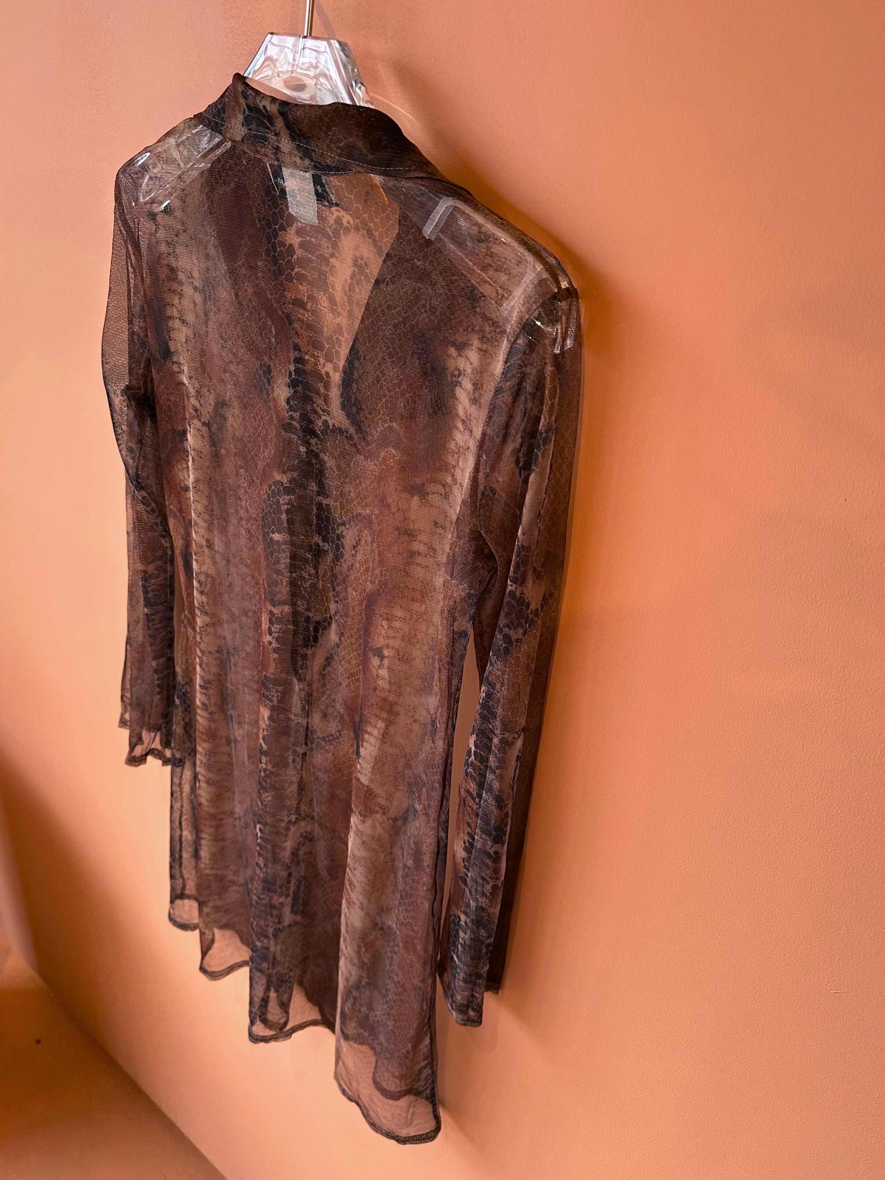 ダークブラウンのボディに、フェードがかったパイソンプリントがモードな空気感のシアーロングシャツです。